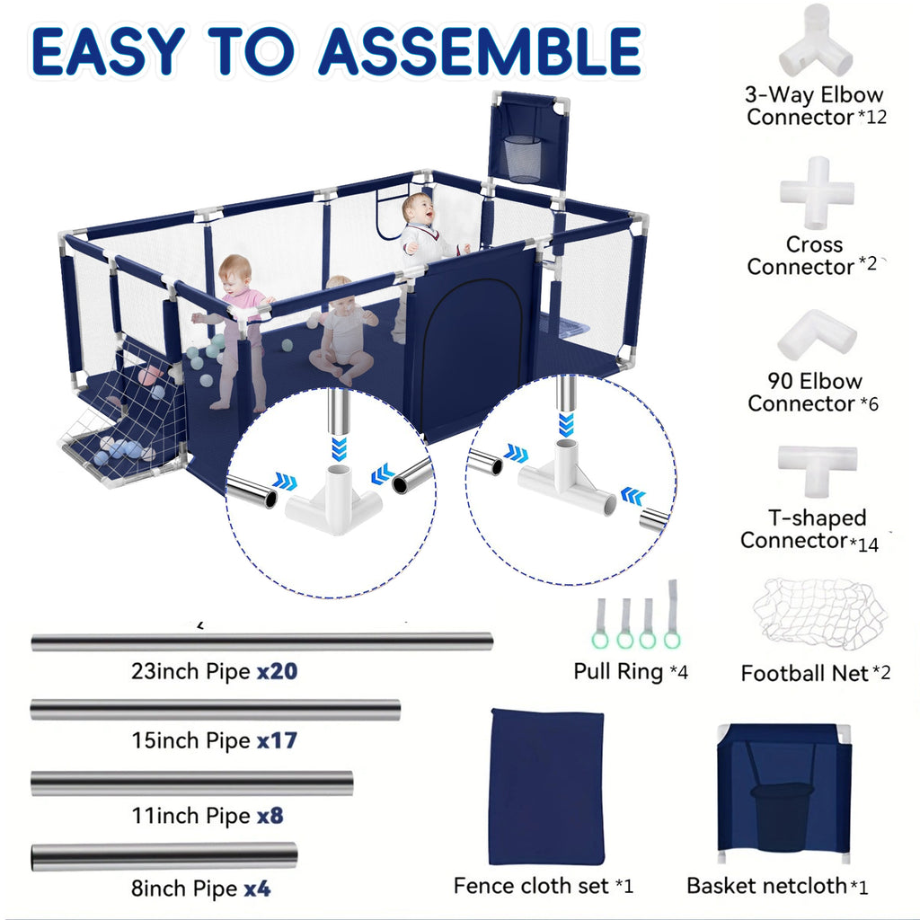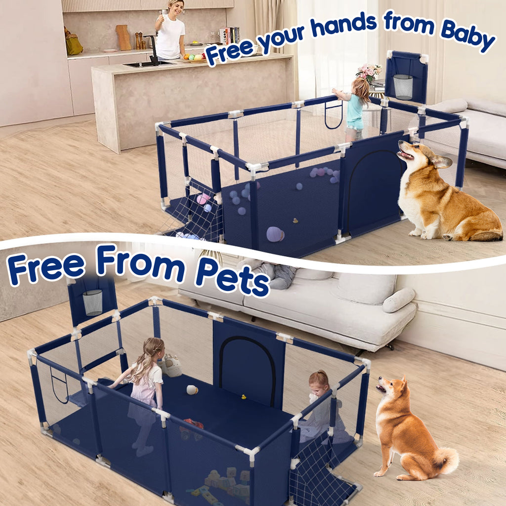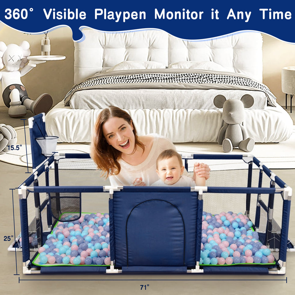 HioHa Large Baby Playpen for unisex and toddlers size is 71.5*46*26 inch (here size is the inner diameter of the Baby Playpen for babies and toddlers), outside size is 90*48*26inch (Including football at both ends), parents can look after them outside it directly while doing housework or chatting, gossiping without worrying about their safety! What a release for Parents! This playpen is designed with breathable and visible mesh. You can observe your baby's behavior in the play center easily. Good to pay attention to the baby and keep them safe.