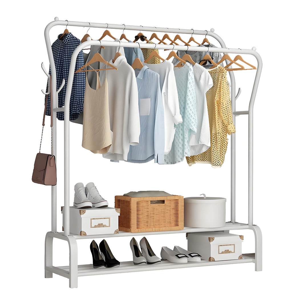 HioHa Clothes Rack, Double Rail Clothing Drying Rack with 2-Tier Shelf, Heavy Duty Garment Rack with Coat/Hat Hanging Hooks, White