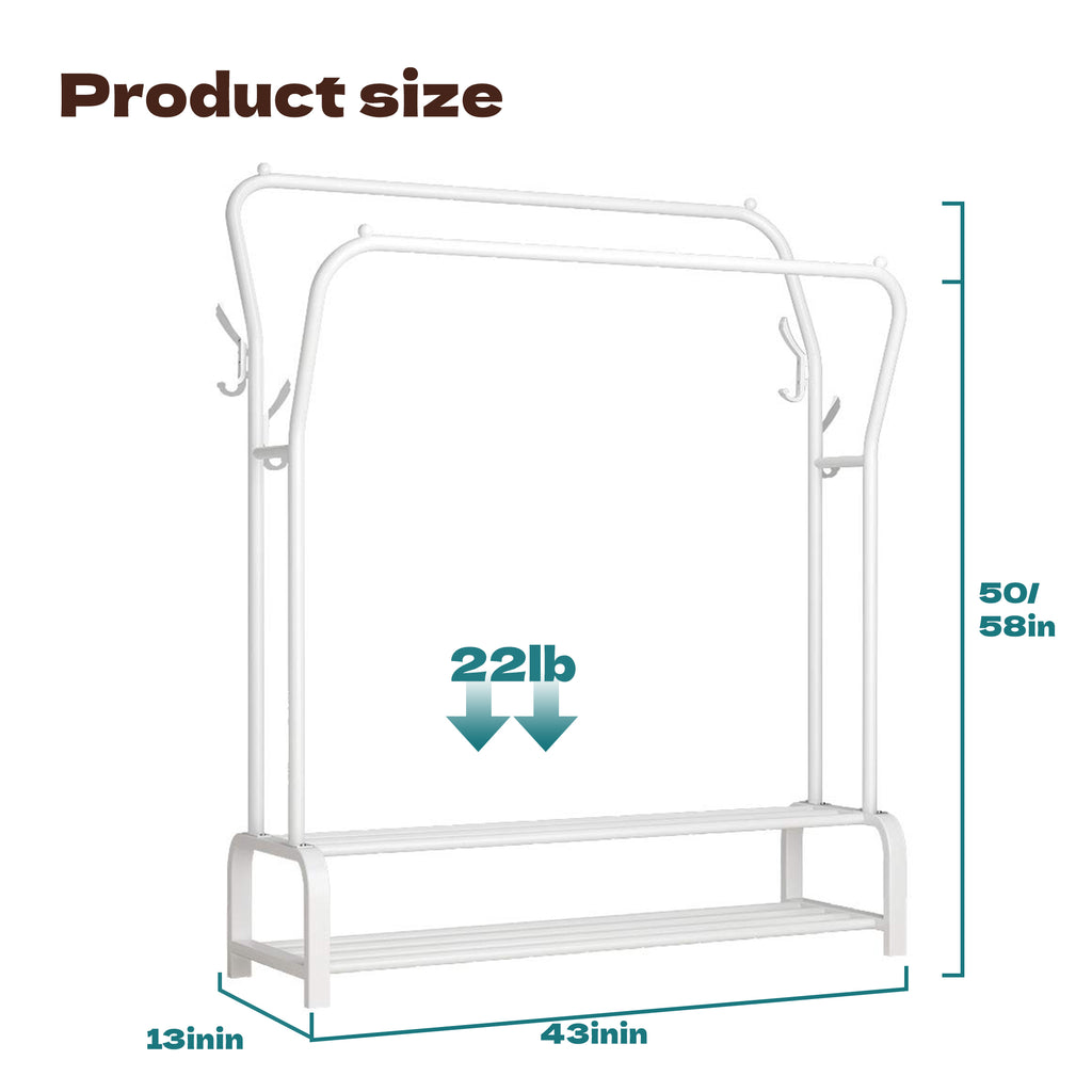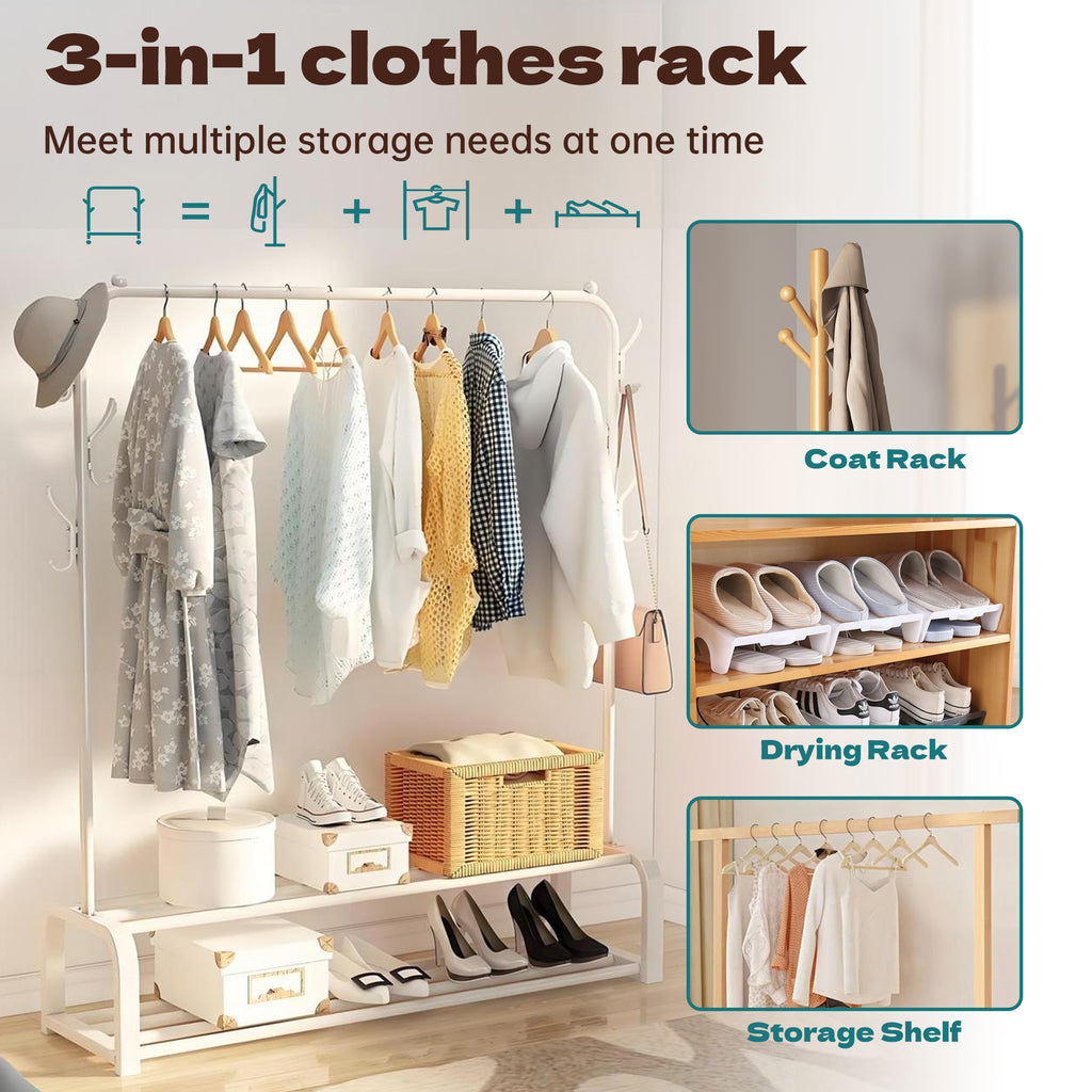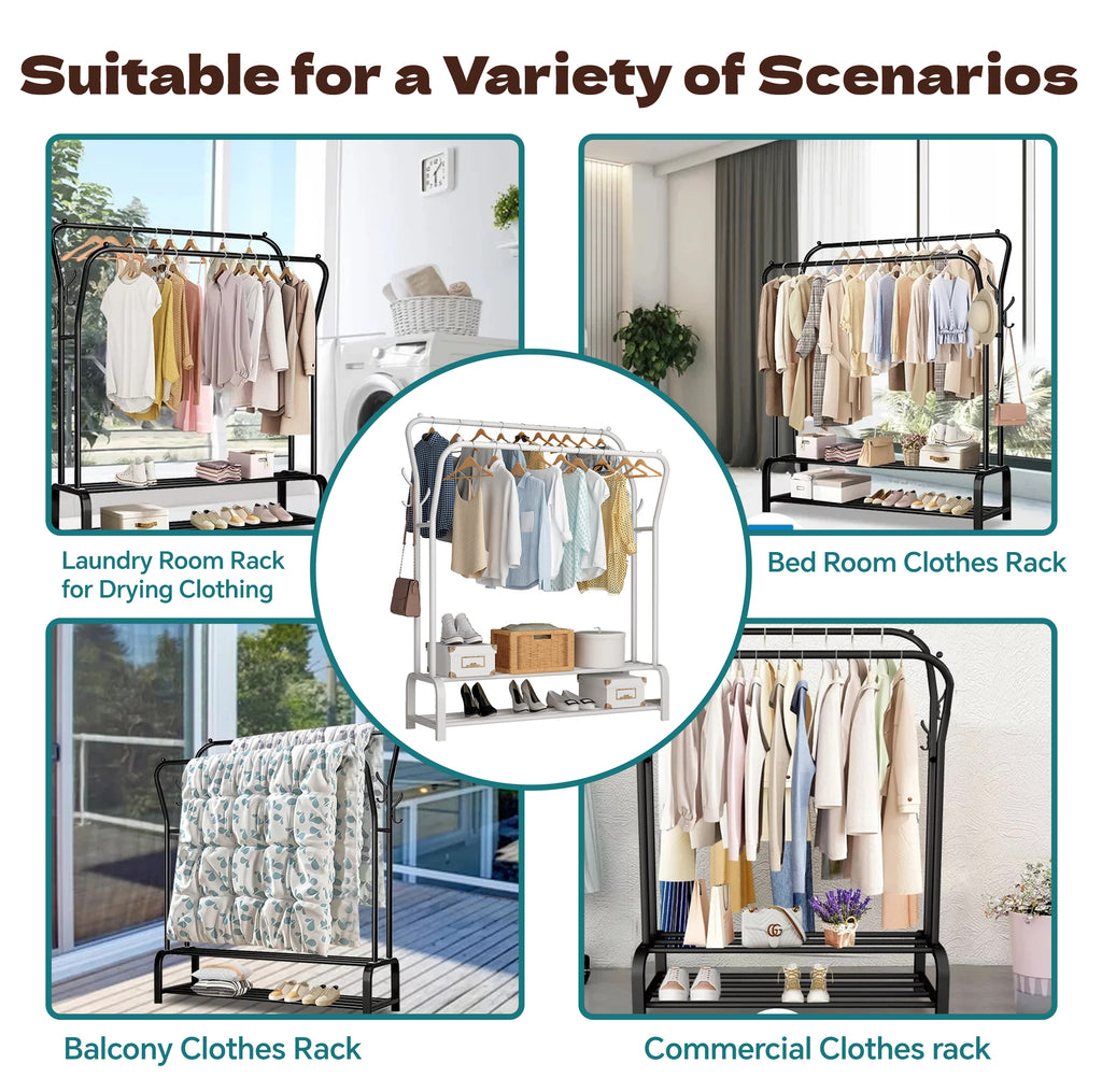 - 【Multi-functional Storage】HioHa clothes rack is designed as a high and low double rod type, which can meet the hanging needs of different lengths of clothes, the design of hooks on both sides can increase the storage space for bags and hats, and the two shelves at the bottom provide additional storage solutions for boxes and shoes, realizing one-stop storage and organization.