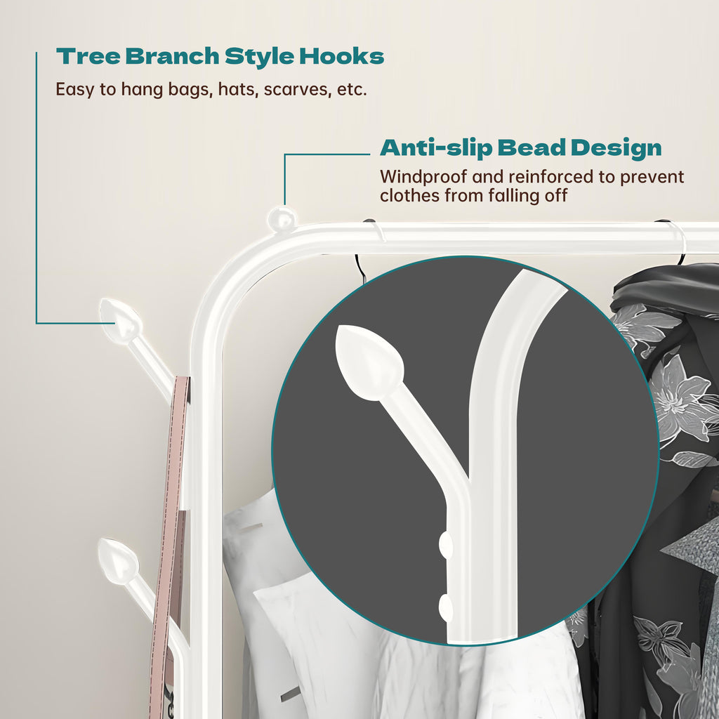 - 【Aesthetics & Safety】The garment rack is fitted with four anti-slip beads at the top, which not only effectively prevents clothes from slipping off, but also adds to the aesthetics of the clothing rack, making it an elegant addition to the interior. The surface of the rack is coated with an eco-friendly paint layer, which not only prevents the rack from rusting, but also this coating is environmentally friendly and ensures home safety.