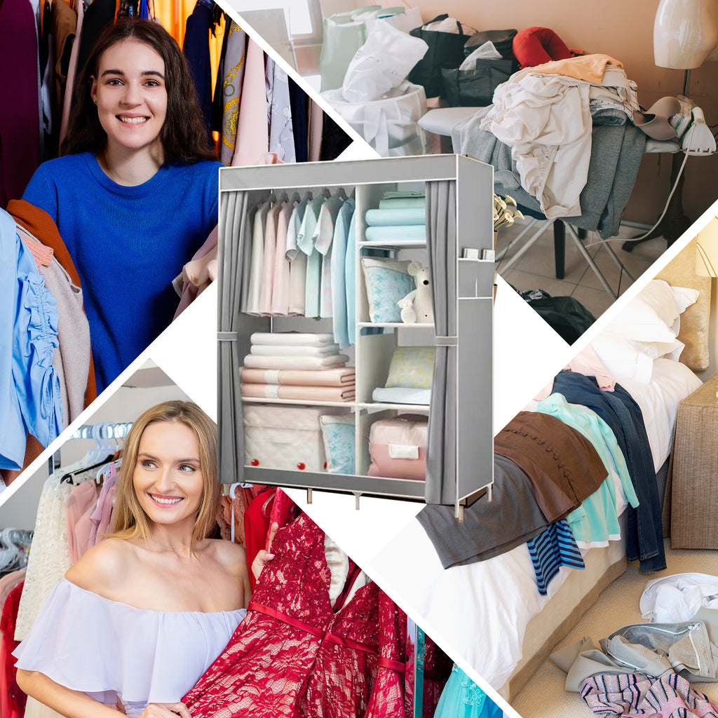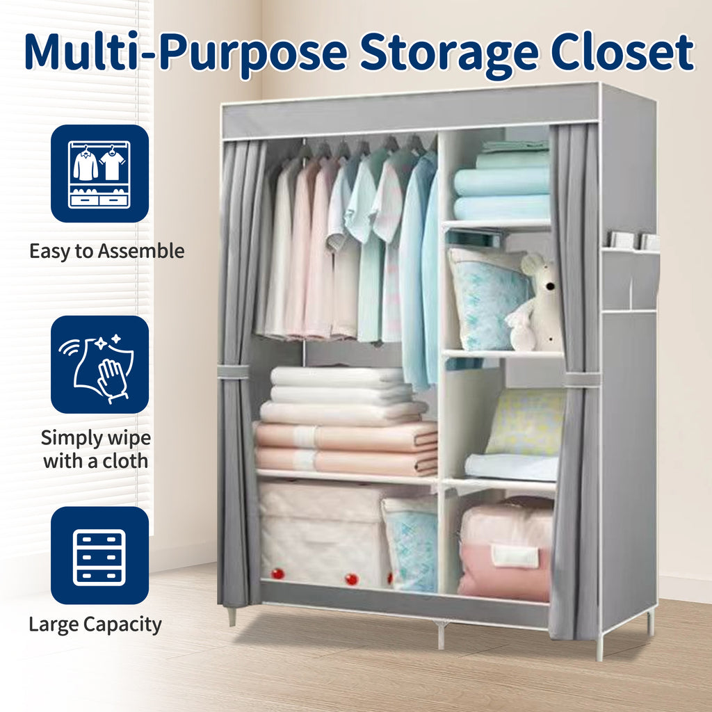 - 【Multi-purpose Storage】The portable closet wardrobe consists of 5 storage shelves and 1 side compartment. Equipped with hanging rails for clothes and hangers for hanging long garments, coats and sweaters. The storage shelves are suitable for folded items, handbags or hats. The side pockets are designed to organize small items such as towels, scarves or socks. There is also extra space at the bottom for shoes, and it is also convenient for cleaning the room.