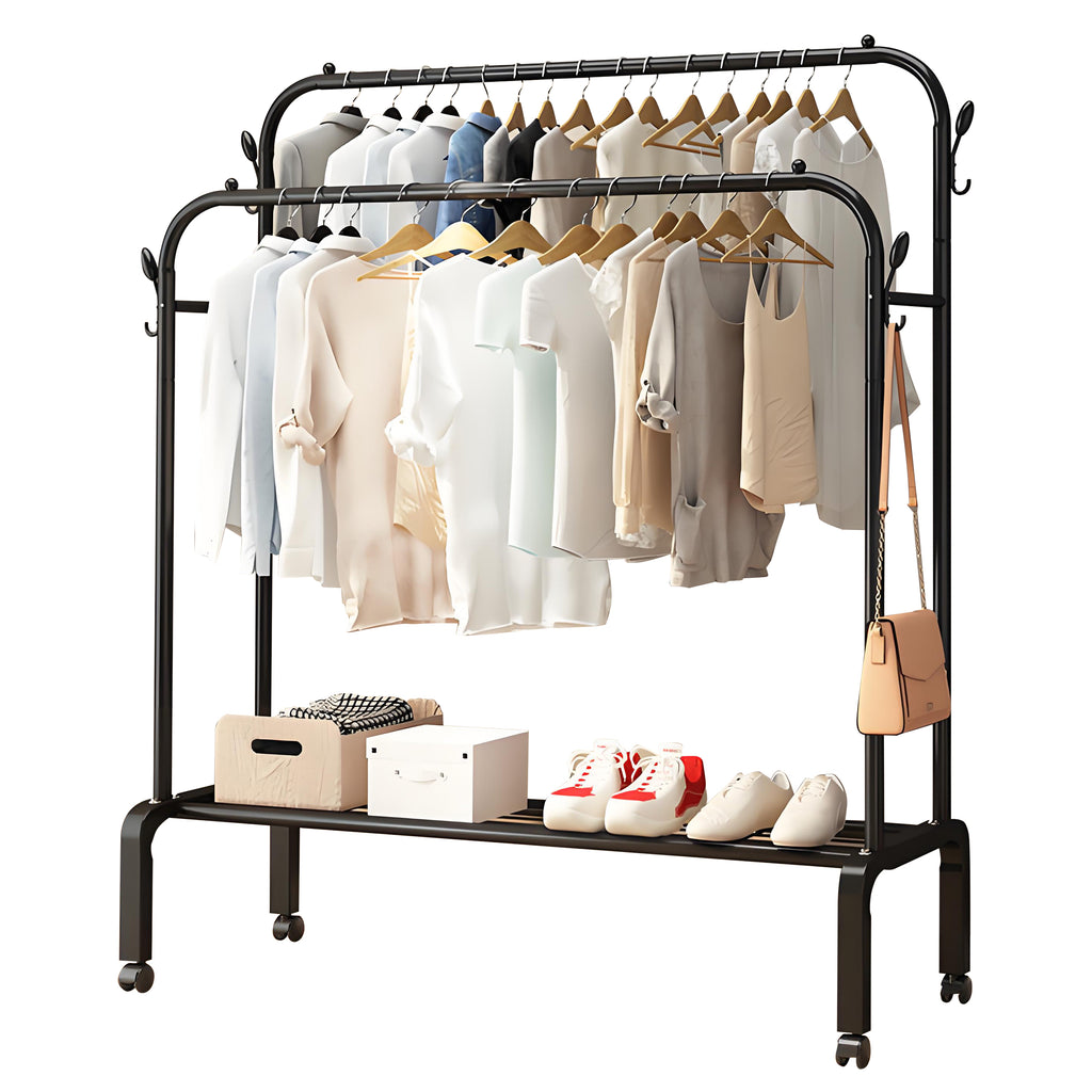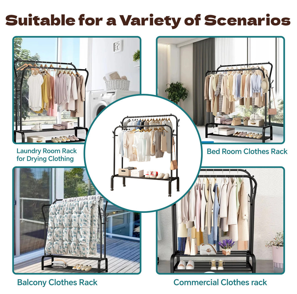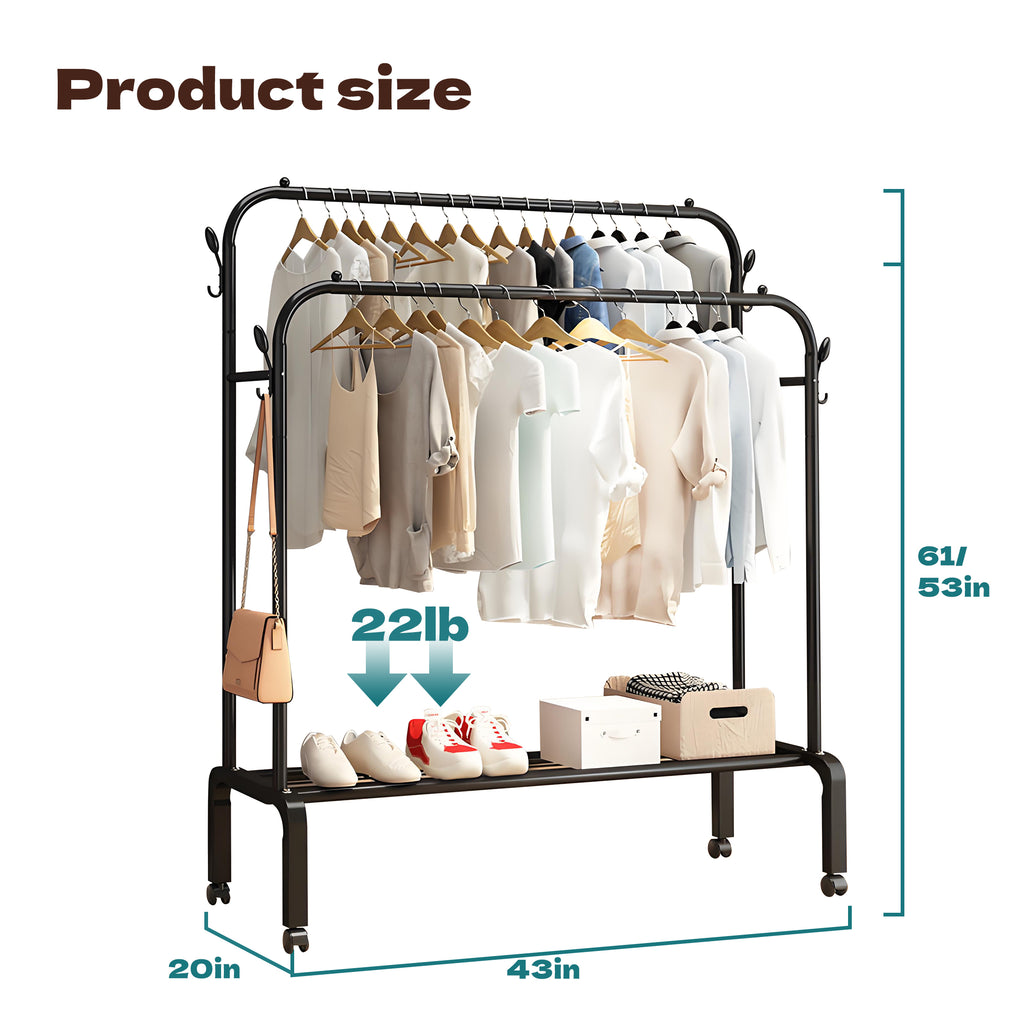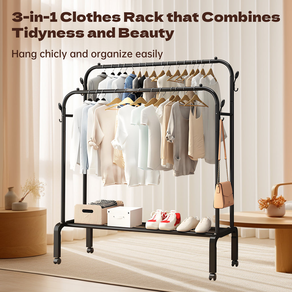 HioHa Rolling Clothes Rack, Double Rail Clothing Drying Rack with 2-Tier Shelf, Heavy Duty Garment Rack with Wheels, Black