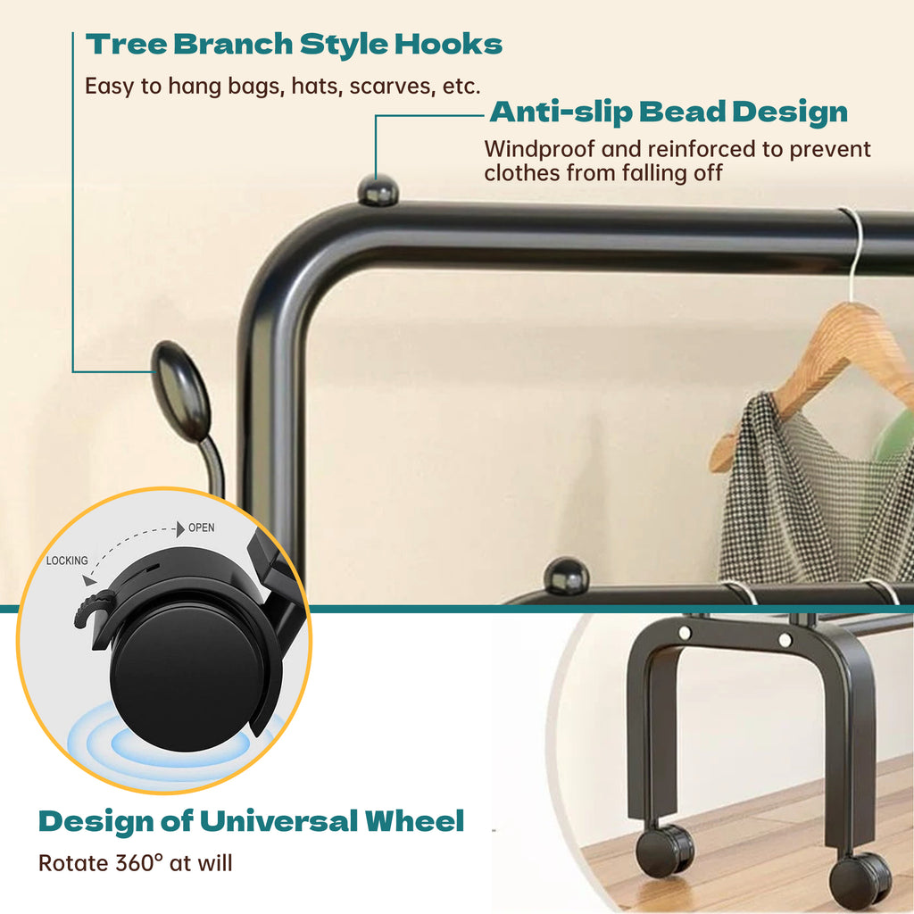 - 【Multi-functional Storage】HioHa clothes rack is designed as a high and low double rod type, which can meet the hanging needs of different lengths of clothes, the design of hooks on both sides can increase the storage space for bags and hats, while the bottom shelf provides additional storage solutions for boxes and shoes, realizing one-stop storage and organization.