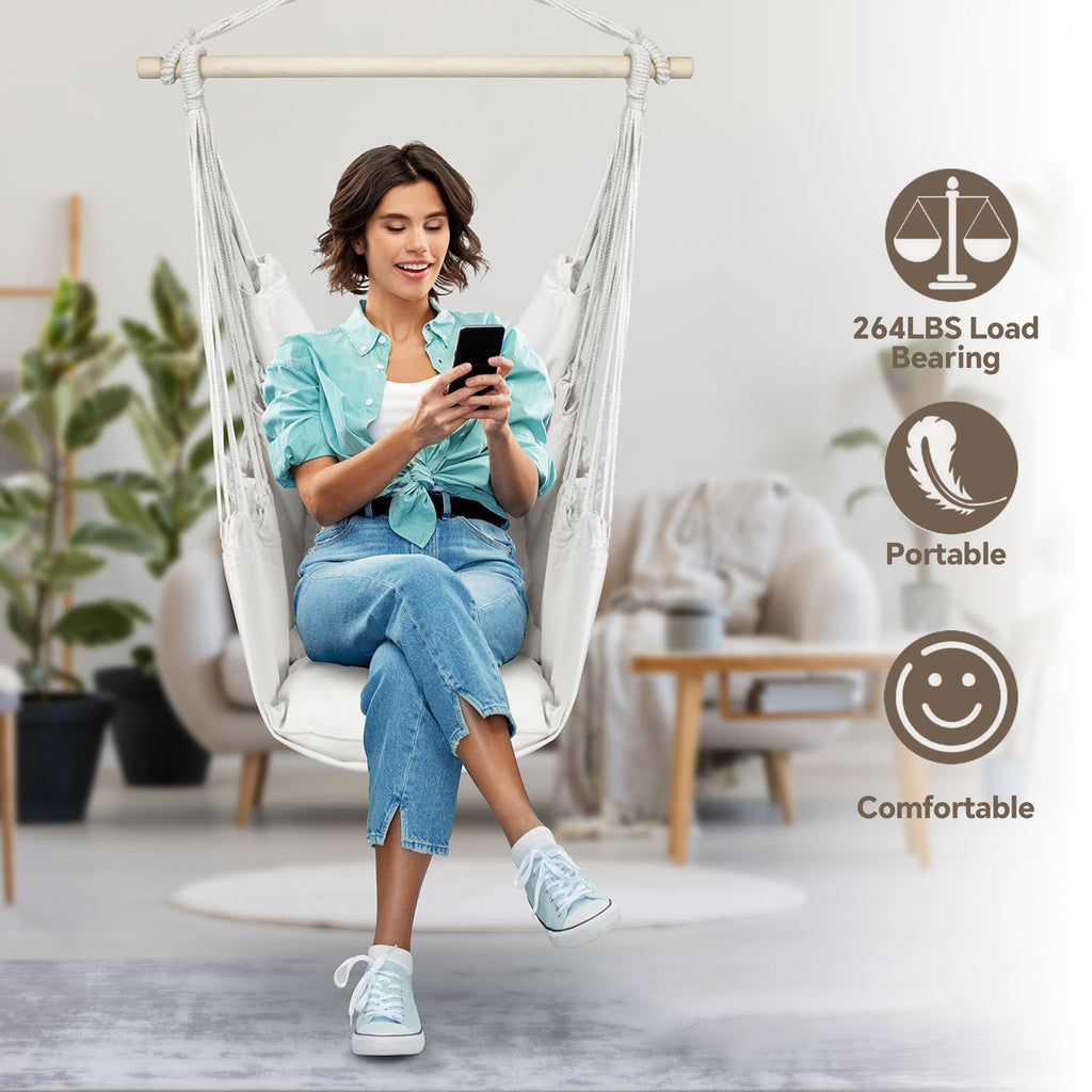 HioHa Hammock Chair, Hanging Rope Swing Max 264 lbs with Anti-Slip Grooves, Hanging Chair Relax Cotton Weave with 2 Cushions, for Indoor/Outdoor Home Yard Garden(White)