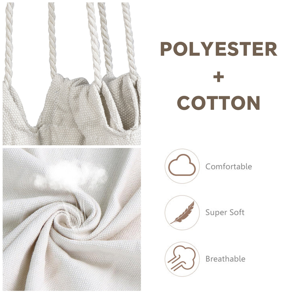 - 【Safe and Strong】Our hammock chair is equipped with a strong wood bar of approx.There are two grooves at the ends of the wood bar to catch the rope and prevent slipping. There are 26 hanging cords on each side of the chair to distribute weight and keep balance. The cotton-blend chair cloth increases the load-bearing capacity of the chair and the wear resistance of the fabric.The load capacity is up to 264 pounds.