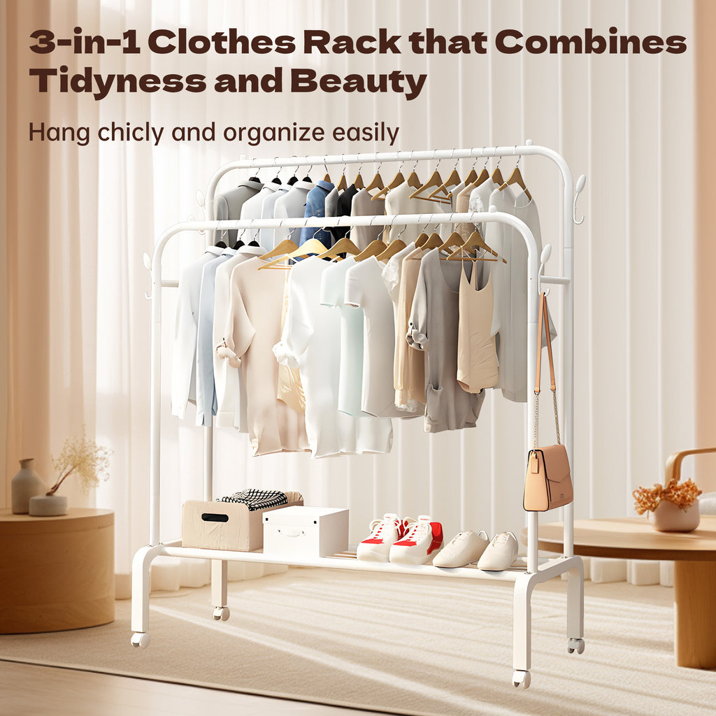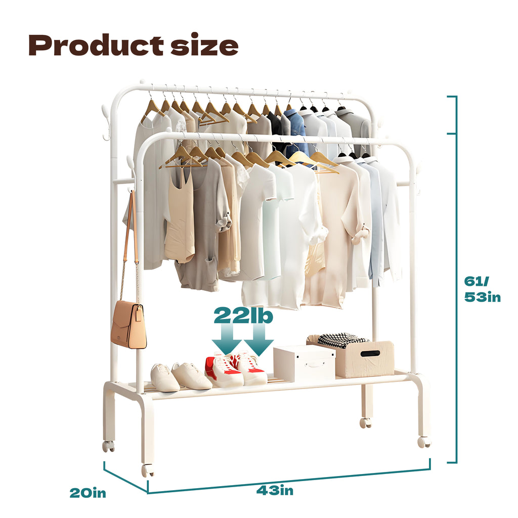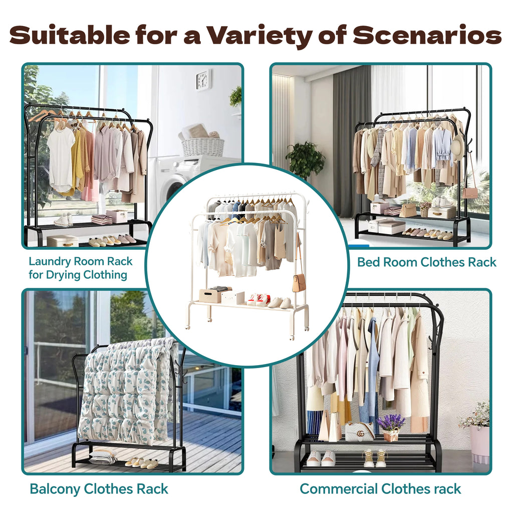 HioHa Rolling Clothes Rack, Double Rail Clothing Drying Rack with 2-Tier Shelf, Heavy Duty Garment Rack with Wheels, White