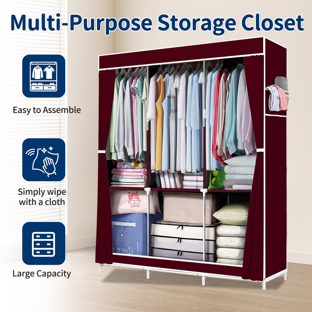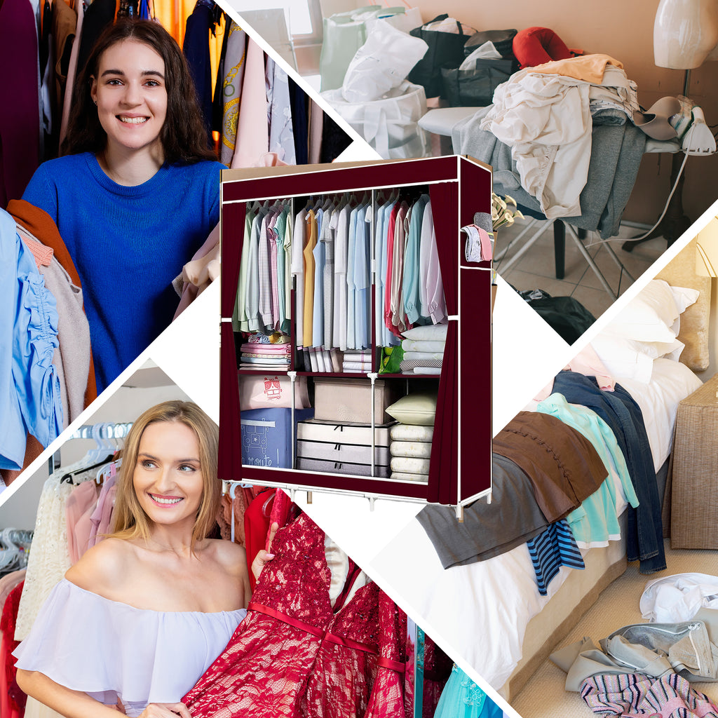 - 【Multi-purpose Storage】The portable closet wardrobe is made of upper and lower parts, the upper is 3 hanging rods for hanging long outfits, coats and sweaters. The lower is 6 storage shelves, perfect for the folded stuffs, handbags or hats, etc. Designed with side pockets to store small objects, like towels, scarf or socks. There is extra space for placing shoes at the bottom, and makes it easier to clean the room at the same time.